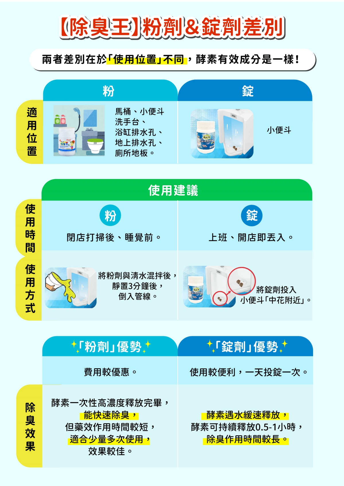 【除臭王】採先進定植包埋科技製成錠劑酵素,確保酵素的最高活性,遇水之後以100%的清潔效力姿態,深入分解、軟化尿垢,安全、環保、不傷水管,天天使用不僅能清除小便斗臭味,也可減少水管尿垢堆積。