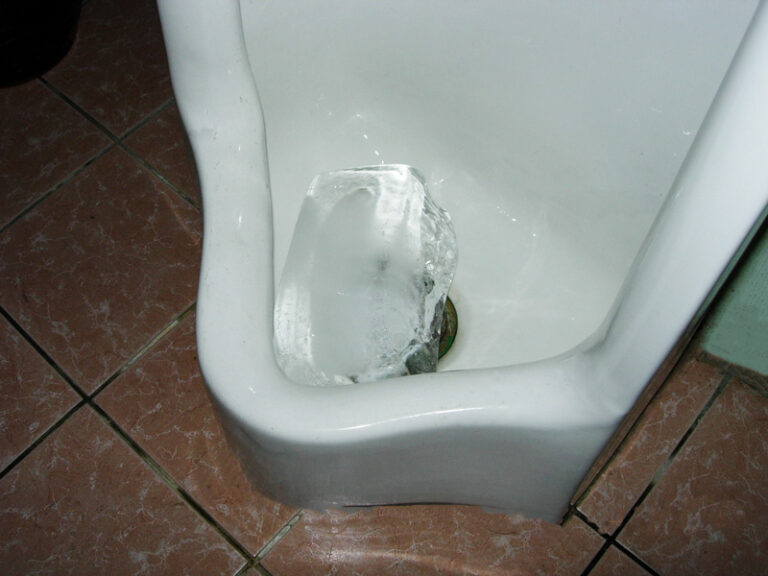 餐廳、小吃部經常使用冰塊來除臭,就像右圖這樣直接將冰塊丟在小便斗中。冰塊雖然可以降低管線溫度,延遲管線中雜菌發酵發臭的速度,但困擾的是一天要添加好幾次冰塊,且冰塊不能分解尿垢,無法消除臭源,治標不治本!