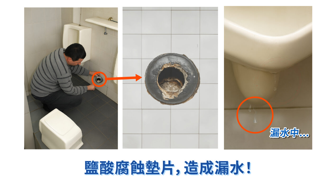 小便斗管線阻塞時,清潔人員經常使用鹽酸來解決塞管問題。但鹽酸的pH為2,是腐蝕性極高的強酸,以高濃度強酸溶解管垢時,也會毀損墊片及螺絲,造成漏水問題,尿液隨漏水處滲出,不但影響客人如廁品質,更會增加修理的費用。