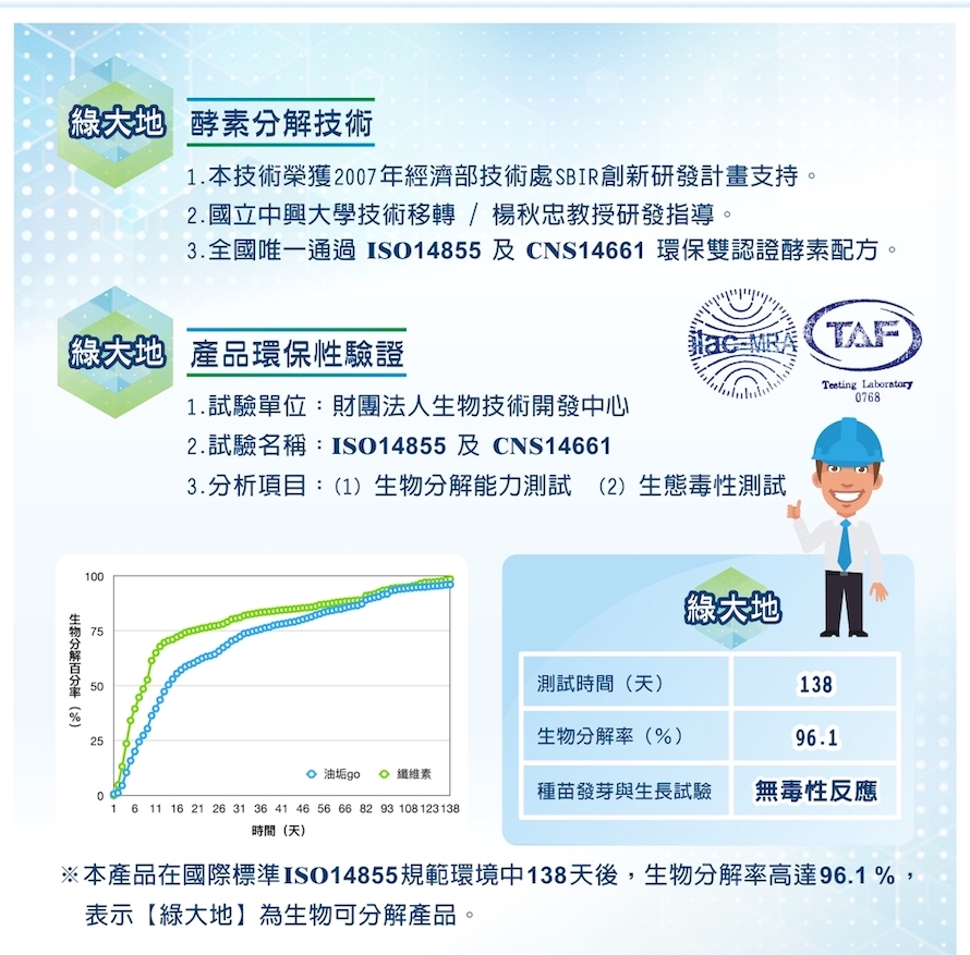 鹽酸的pH為2,是腐蝕性極高的強酸,故以鹽酸處理尿垢時,經常發生使用者皮膚不小心被鹽酸侵蝕,或水管墊片脆裂漏水等問題。【除臭王】的pH為5.5,酸度僅為鹽酸的千分之一,且【除臭王】獨家生物除臭技術榮獲2007年經濟部技術處SBIR創新研發計畫支持,中興大學楊秋忠院士技術指導,產品完全採用天然環保配方,整合酵素除臭、除垢二大功能,是全國唯一同時通過 ISO14855 及 CNS14661 雙重認證的生物除臭產品,證明【除臭王】為環境友善、安全無毒產品。